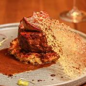 Wagyu à Rossini com foie gras selado, creme de trufas negras e batata rösti.